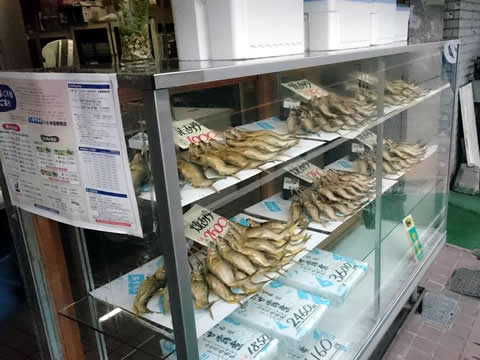 I couldn't do fishing for typhoon. Photo is a river fish specialty store. Fish is cheap and so tasty!