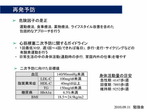 日本循環器学会の『心筋梗塞の二次予防に関するガイドライン』によると、「LDL100以下」が数値目標となっています。