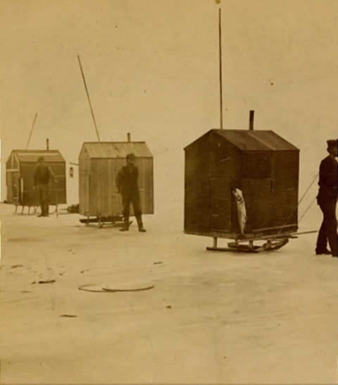 アメリカ五大湖の内ヒューロン湖のサギノー湾の1900年の氷上釣り小屋の写真!