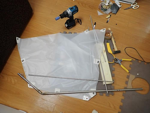 新しいカヤック用のスパンカーを作っています。なんとか最初のヒメマス釣りまでに間に合わせたいです。