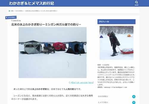 わかさぎ釣友フィルの写真を使わせてもらって、北米の氷上わかさぎ釣りを紹介するページを作りました。