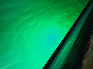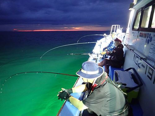 この釣りでは、水中に強力な緑ライトを照らし、魚を集めます。