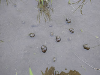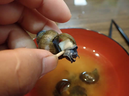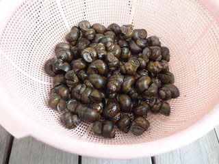 I made Miso-soup with pond snail. They usually live in paddy field. I took them in fallow field and spent a few days getting the mud to spit out. That’s taste is good, similar to freshwater clam.