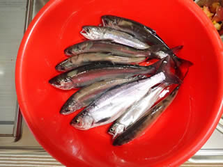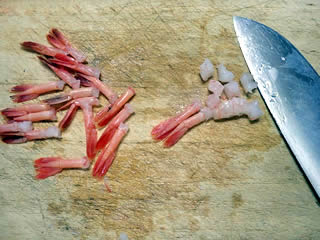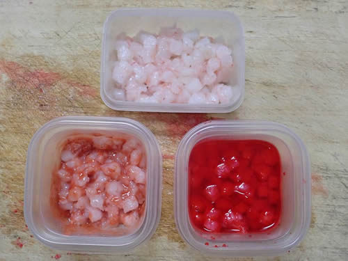 切っただけのもの、食紅で染めたもの、集魚剤に漬けたものの3種類です。