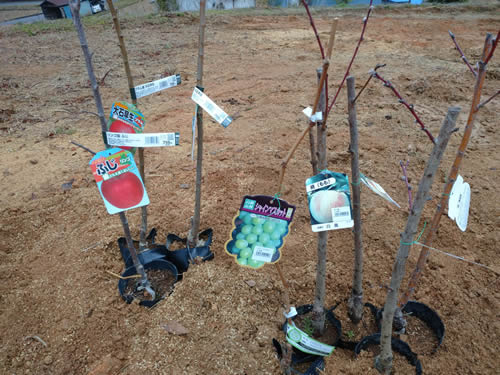 プラム、桃、ぶどう、りんご、ブルーベリーなど17本の苗木を800㎡の土地に植えます。