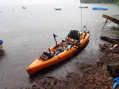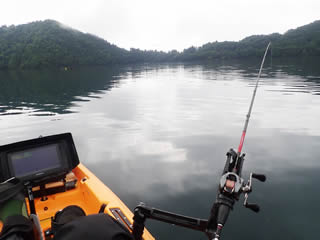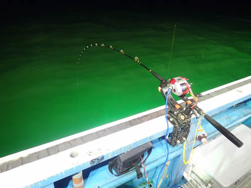 この釣りでは強力な緑ライトを使って魚を集めます。