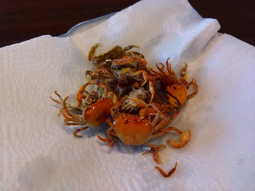 I went catching the very small crab in small stream where a bear live. When fried in oil, it is crispy and tasty.