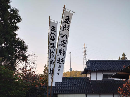 Today is a festival at a small shrine on the grounds of my house. The object of worship is "Inari"(The god of fox). We raise the flag and offer food. In the past, children's dances were dedicated in front of the shrine.