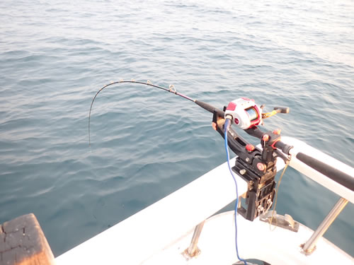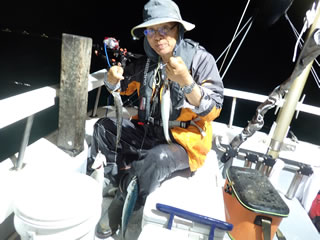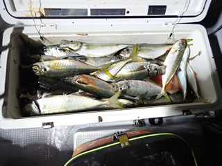 Night fishing in Japan sea. Catch was very good, horse mackerel 49, mackerel 3. Under the strong green light, they gather here. Both the sashimi and salted grilled fish were delicious.