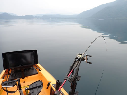 Unfortunately, I only caught small two, but I was able to see the face of a kokanee. It was difficult fishing because there were very few fish. But I had a lot of fun because I was able to float a kayak on the emerald green lake surface and take a nice hot spring bath. This lake is in Japanese national park.