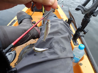 Smelt fishing on kayak for the third time. It was good and I caught 144 fish. The bait is mosquito larvae. In Japan, the autumn leaves have begun to change colors, and it is very enjoyable to fish while taking in the beautiful scenery. And today I discovered a new way to fish. I want to call it “smelt trolling” or “smeltrolling” for short. Pulling rigs at low speed with the kayak, I caught two or more fish quite often. It was very interesting.