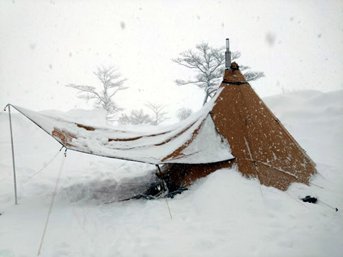I've finished setting up the tent. It's been snowing a lot, 12 inches since we arrived. There's almost 7 feet of snow. I love being comfortable in this harsh wilderness with my equipment and ingenuity.
