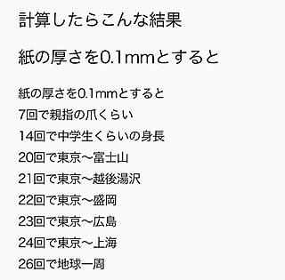 有名な話しでは・・・紙を43回折ると月に到達できる。
