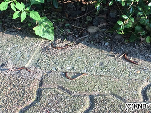 夏の朝 アスファルトの道路 に ミミズの大量死