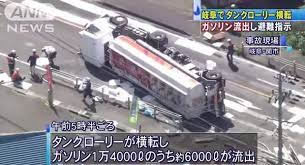 その タンクローリー車 道路脇 に 突っ込んで行きましたよ。
