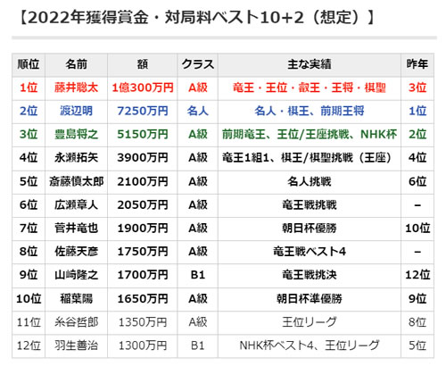 先日ネット記事で 将棋界報酬ランキング と言うものが