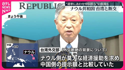 南太平洋の島国ナウルは15日、台湾と断交し中国と国交を結んだと発表