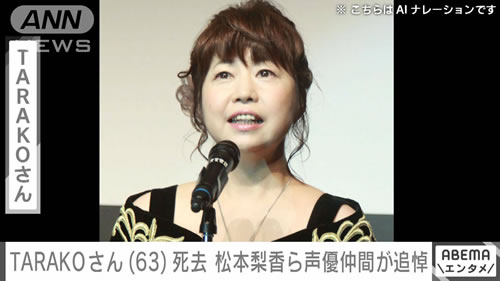 声優TARAKOさん(本名非公表)が亡くなったことが9日、分かった。