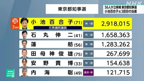 小池氏291万票 石丸氏165万票 蓮舫氏128万票