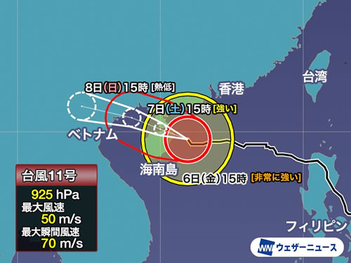 台風11合 猛烈な台風 になって 中国大陸 に 向かっているそうです。