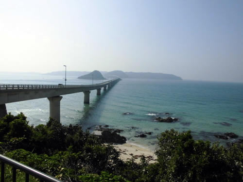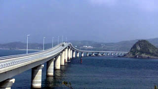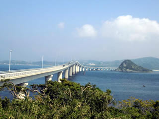 青い空とエメラルドグリーンの海にかかる一本の長い橋。