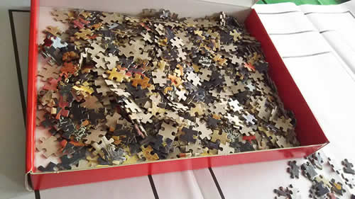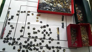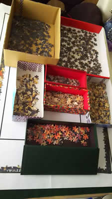お天気の悪い日が続きます。 ジグソーパズルにはピッタリかな❔ 同色の微妙な色合いがつかめない老眼😩 もうとっくに出来てもいいのにまだ完成していません😅
