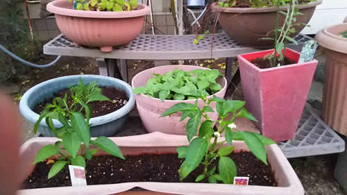ということで、ミニパプリカの後ろはバジル🎵 今年も食べられそうです👍 地植えのゴーヤが伸びません