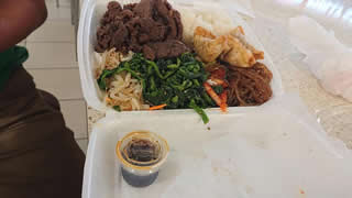 十種類の中から四種類のお野菜をチョイスしておまけのクーポンを見つけたのでそれを使って餃子三個もプラスしたBBQプレート(二人前はあるごはんも入ってます)。 これは一人では食べられない量、これで$15。