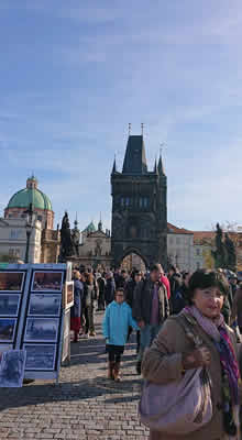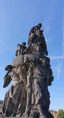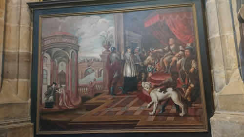 この絵は14世紀のボヘミアの司教がヴァーシラフ四世の王妃の懺悔の内容を厳守したため王様の怒りに触れてカレル橋から投げ落とされてしまったお話が描かれています。のちに司教は聖人となりました。