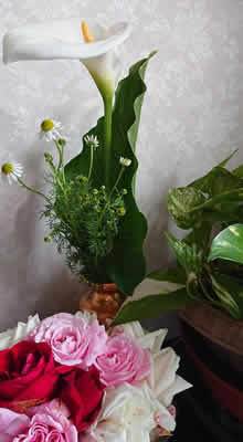 もったいないけれどあまり次望み鼻を咲かせるために花摘み、我が家に咲いてくれるカラーの花とカモミールもコラボです✨
