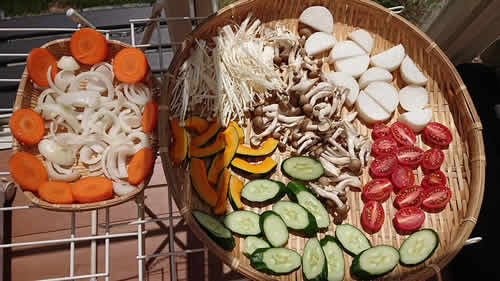 お墓参りで熱中症ぎみになり数日動けず家でゴロゴロ😖 これじゃ いかん❗ってことで暑さを利用しての乾燥野菜作り🥕🥒🧅🍅🍄 これを食べてパワーアップ😆👍️❤️