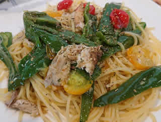 ミニトマトとピーマンとお魚のペペロンチーノ。辛さが足りなかったかな😅