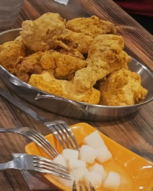 並んでいたけれど思ったより早く座れました プリンクスチキン、想像以上に美味しかったけれど口の周り粉だらけ