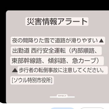 慌てて翻訳アプリで調べたら雪で路面が凍ってるから気をつけるようにって それってアラート必要?日本ではないアラートでした。