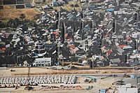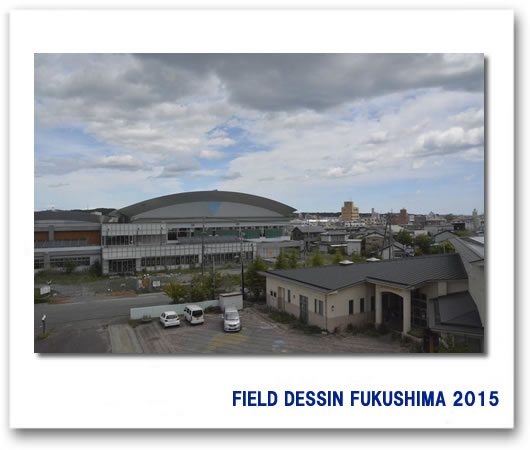 写真はフレセンから見た浪江の体育館と役場に置かれた浪江(請戸)の航空写真。