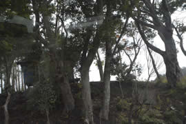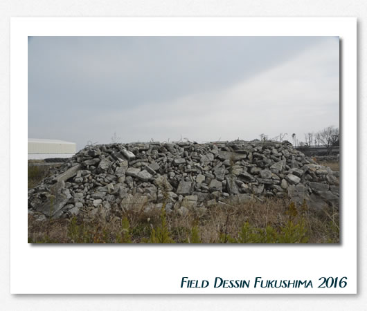 毛萱地区の様子。不燃性の瓦礫の山の向こうには海が見える。 集落は被災したが観音堂だけ少し高い場所にあるため被災を逃れた。