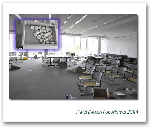 2011.3.11東日本大震災当日ここでは東京電力関連企業のセミナーが行われていた。演題は「ヒュ一マン工ラ一を防ぐために」産業心理学の立場からの・・。まさしくその公演中地震が起きおよそ1時間後に津波が来たわけである。その直後この場所は即時避難所となる。11日夜、職員が炊き出し支給したオムスビ・・・。翌日朝6時に避難指示が出てここの避難者は隣村の川内村へ避難することになる。ここは一日だけの避難所となったわけだが今なおその時の痕跡がそのまま残っている。避難者のために職員が握ったオニギリの温もりはアルミ箔の形でそのまま残っているのだ。(実〈み〉はすっかり干からびてしまったが・・・)あのパニック状態・緊急事態の中で何をしたのか・・何ができたか・・・。その場その場で考え行動したベストがここにはあった。(2014.6.11)tomioka |