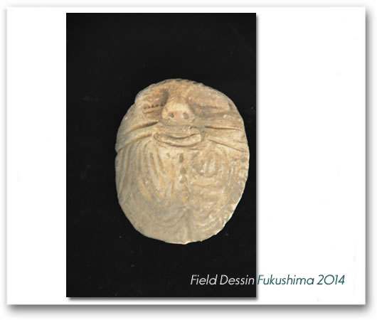 富岡町で発掘された土版。福島県の浜通りには多くの縄文遺跡があります。つまり、この土版ができるずっと以前からここに「人」が生きていたということです。私の考える「未来」は、この地に人が生活を営むようになって経過した…せめて同じ時間を人がここで生きて行けるようにしなければ…ということです。今行政が金目で行っているような除染や復興を進めろ!ということではありません。今取り残されつつあるこの土地が(今は穢れの地として忌み嫌われる「この場所」ではありますが)いずれは(私たちが想像できる未来の…そのまた先の未来で)自然に浄化され、もしかしたら「楽園」になるという可能性があるということです。復興とは「未来」を保護することだと思うのです。そうなるように今を生きるべきなのです。この土版の表情は…優しく…とても豊かです。こんな表情を未来のここの「人」たちに期待したいのです。私の夢です。(2014.7.16)福島県立博物館 |