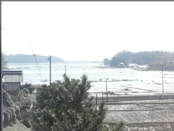 揺れたとき私はここにいたんですけど津波は頭になっかったですよ。すぐテレビさ消して中にハァ居たもんですから。1時間後ですよ(津波が)来たのは、何かが浮いて向こうの方から来るのが見えたもんですから。波が違う方向から来ているのに気がつかなくて波がまわってきて「ああ来ちゃった来ちゃったって」瓦礫が行ったり来たり右往左往しているのがすごかった。3週間は水引かなかったから・・。瓦礫撤去の時、瓦礫の匂いはえらっこくて呼吸困難になりそうだったの。瓦の片付けやってるとき、お父さんも「なんだこれ咽イライラすんな」て。風がまともに来るし、そんな時はマスク掛けて屋内待避だ(マスクを掛けたまま家の中にいた)風の強い日は外にでんのが嫌で家の中にいて2~3日落ち着いて風のない時は出て歩って・・1週間は避難したけど・・・近所の人もみんないなかったよ。帰ってきて、みんな、どこに行ったんだべって。ほんとみんないなかったよ。 |