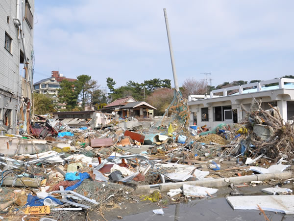 23年4月南相馬市避難所にて 写真は23年4月相馬原釜。