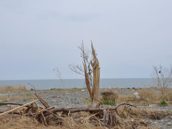 ある時、 海岸から100㍍も離れていない場所に 根は張ったまま幹が裂け まるで天に向かって槍を突き上げているような 一本の木が残っていた