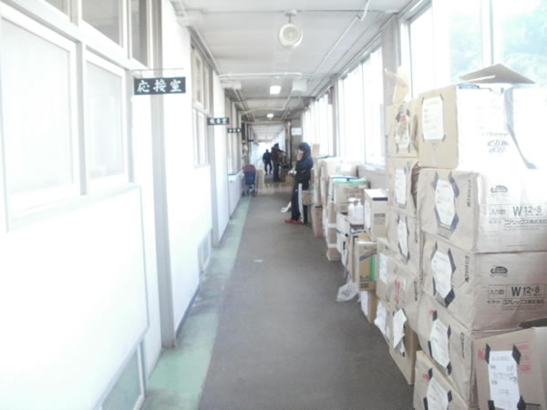 ※この避難所は閉校になった元県立高校。非難されていた方達は集落(ご近所さん)ごとに各学級に入っていた。風邪がはやっていたので(感染など考えると)体育館などに大人数でいるより、ここの方がいいという人もいた。ここでは教室内をダンボールで仕切るようなケースは少なかったと記憶する。 |