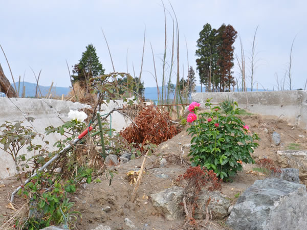 津波の傷跡(建物の土台)しか残らない 住居跡の庭に、 そこに元々植えられていたと思われる 花が咲いていた