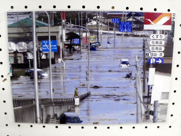 ※写真は当時、避難所掲示板に貼られていた津波が来たときの様子。鉄道の高架橋から東側を撮影、6国手前の様子。 |