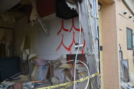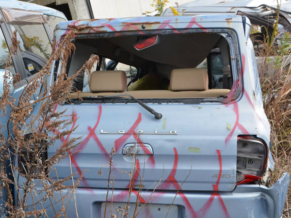 富岡の被災地を歩くとこの赤いペイントの記号?が目に付く。