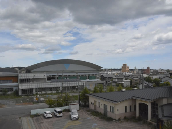 写真はフレセンから見た浪江の体育館と役場に置かれた浪江(請戸)の航空写真。