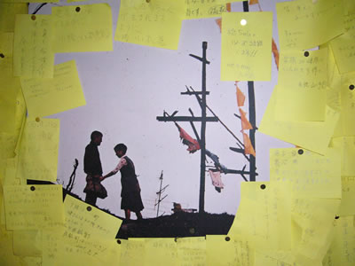 中は 訪れた人たちの願いのこもったメッセージの紙で