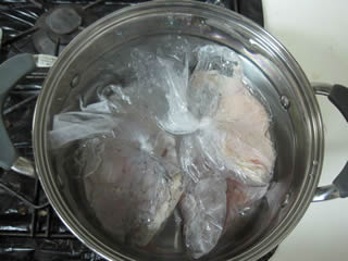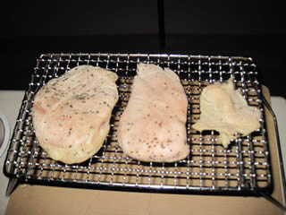塩小さじ1 胡椒少々 バジル少々 砂糖一つまみ 肉を水で良く洗った後、フォークで肉に穴をたくさんあけ、調味料をすりこみ、ビニール袋で密閉。 ビニールのまま70度くらいのお湯に30分。 表面がサラサラするまで陰干し乾燥。 さぁ、ダンボールに網を乗せて密閉。いざスモーク! 途中で煙くなってしまったので、お風呂場へ移動。