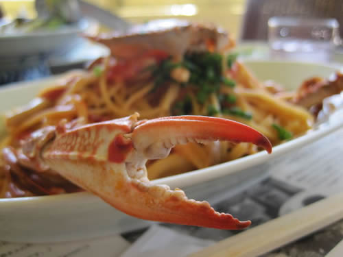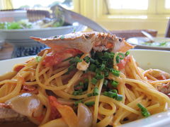 頼んだ物は、オススメと表示してある 「渡りガニのトマトクリームスパゲティ」。 創業以来の名物なのだとか。