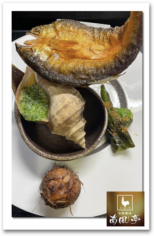 鮎せんべいキャビア添え 真つぶのエスカルゴ風 鮎を風干ししてからじっくり揚げています。キャビアは鮎の下のクリスタルガラス容器に入ってます。鮎せんべいとキャビア これ合うんです😄✌️